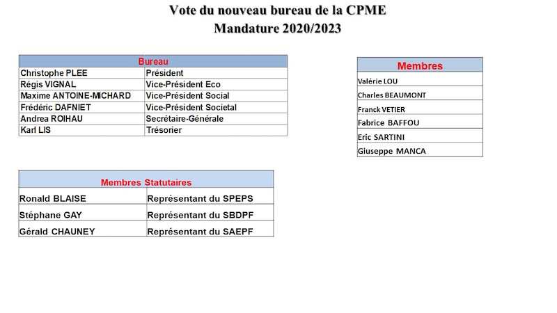 Outre la présentation du bilan moral et financier, tous deux votés à l’unanimité, les membres présents et représentés ont procédé au vote du nouveau bureau de la CPME pour la mandature 2000/2023.