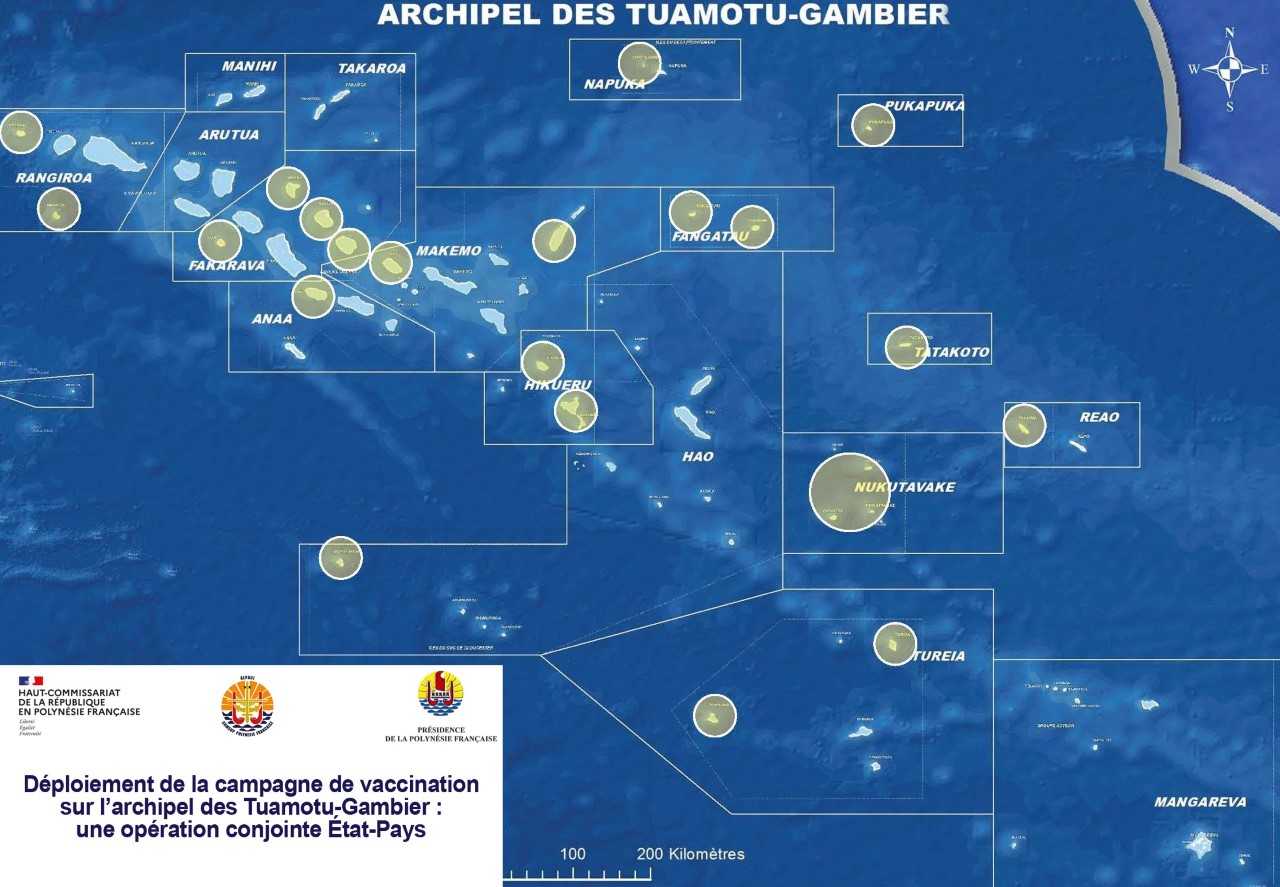 Ainsi, du 20 mai au 17 juin, grâce à l’appui essentiel des Forces Armées en Polynésie française, une opération d’envergure est menée par le Haut-Commissariat (Direction de la protection civile) et le Pays (Ministère de la Santé, en charge de la prévention) auprès des volontaires à la vaccination dans l’archipel des Tuamotu-Gambier.