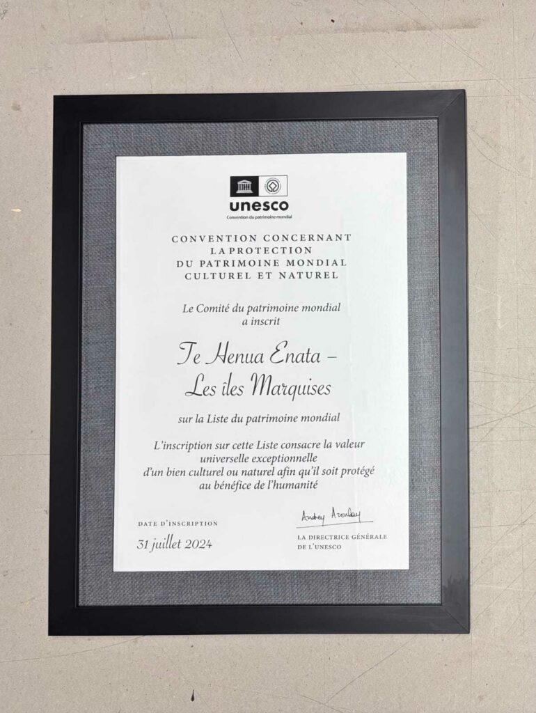 Remise officielle du certificat de l’UNESCO certifiant l’inscription de Te Henua Enata – les Îles Marquises sur la Liste du Patrimoine mondial de l’Humanité. Ce document prestigieux, signé par Son Excellence Audrey Azoulay, directrice générale de l’UNESCO, consacre la Valeur Universelle Exceptionnelle de ce bien mixte, à la fois culturel et naturel, et affirme la nécessité de le protéger au bénéfice de toute l’Humanité.